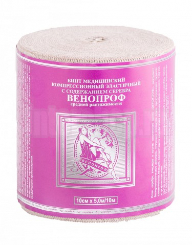 Бинты изготовлены в виде эластичных лент различной длины и ширины. Нити бинта «ВЕНОПРОФ» имеют в составе ионы серебра, что значительно расширяет спектр их применения и устраняет противопоказания для использования бинта.Компрессионные бинты ;«ВЕНОПРОФ» изготовлены из нитей, содержащих ионы серебра. Бинты оказывают выраженное бактериостатическое воздействие и могут быть использованы при кожных заболеваниях. Ионы серебра, входящие в состав эластичного ;бинта «ВЕНОПРОФ», улучшают состояние кожи, предупреждают развитие аллергических реакций, ;положительно воздействуют на микротравмы кожного покрова и трофические язвы. Каждый бинт упакован в комбинированную водонепроницаемую полиэтиленово-бумажную упаковку.